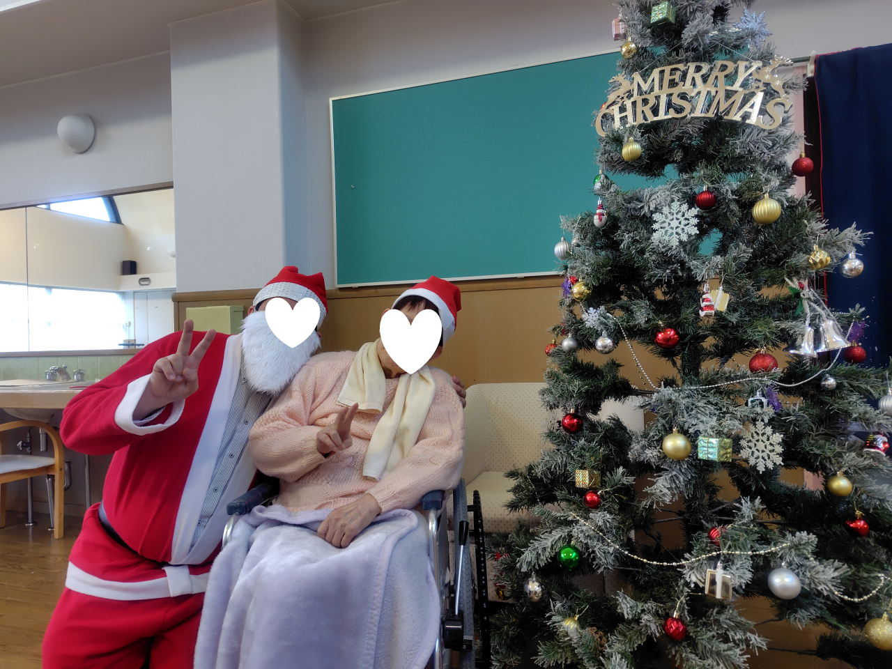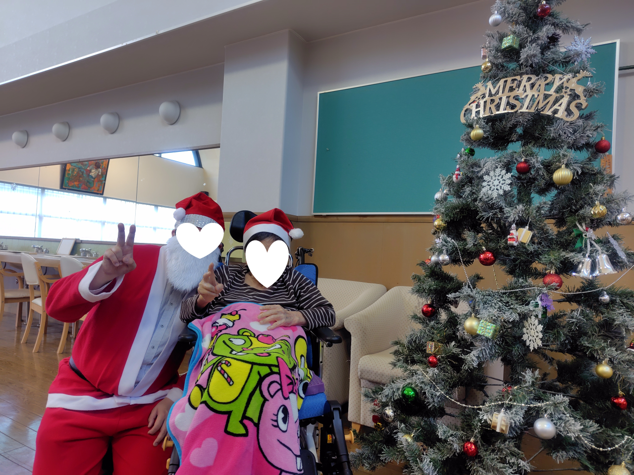 サンタの格好をしたスタッフが登場すると」「わぁ~!」と利用者様の喜ばれる声があり、